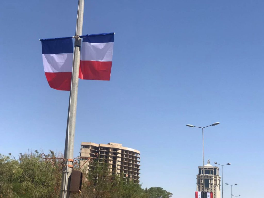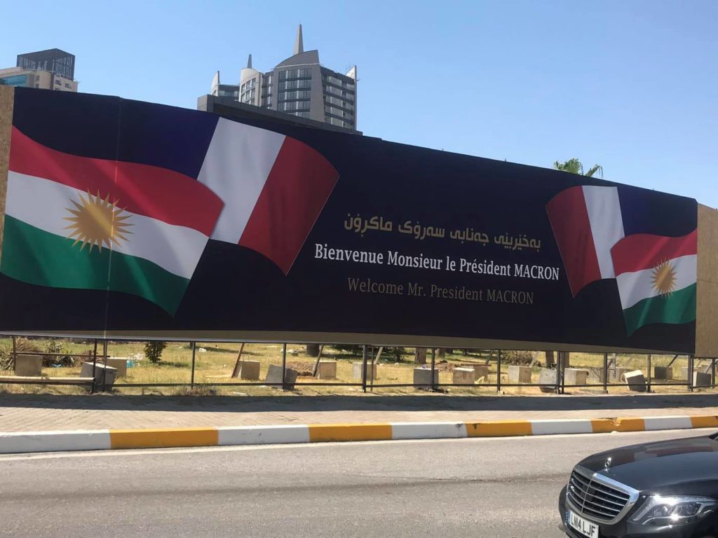 لە بەشێک لە شەقامەکانی هەولێر، بە بەرزکردنەوەی ئاڵای فەرەنسا و ئاڵای کوردستان، پێشوازی لە ئیمانوێڵ ماکرۆن، سەرکۆماری فەرەنسا، دەکرێت.