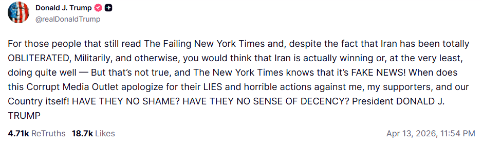 “ڕۆژنامەی نیویۆرک تایمزی شکستخواردوو هەواڵی ساختە بڵاو دەکاتەوە. ئێران لە ڕووی سەربازییەوە سڕاوەتەوە، کەچی ئەوان دەڵێن ئێران سەرکەوتووە! کەی ئەم دەزگا گەندەڵە داوای لێبوردن لە من و لایەنگرانم و وڵاتەکەمان دەکات؟”
